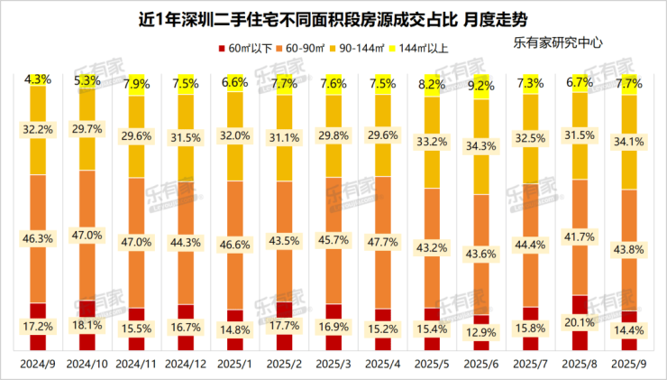 二手住宅领域,90~144㎡以及144㎡以上改善户型成交占比显著增长。