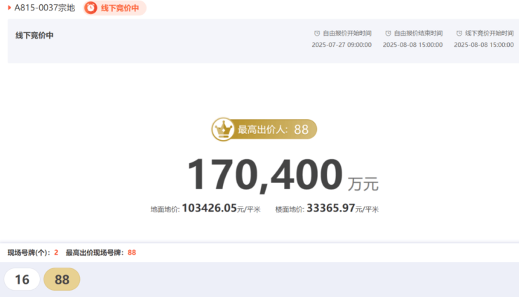 报价32轮,88号举牌,总价一下刷到了17亿,此时楼面价为33365.97元/㎡,比7月30日深业拿下的相邻南地块(A815-0036宗地),楼面价已高出了5000+元/㎡。
