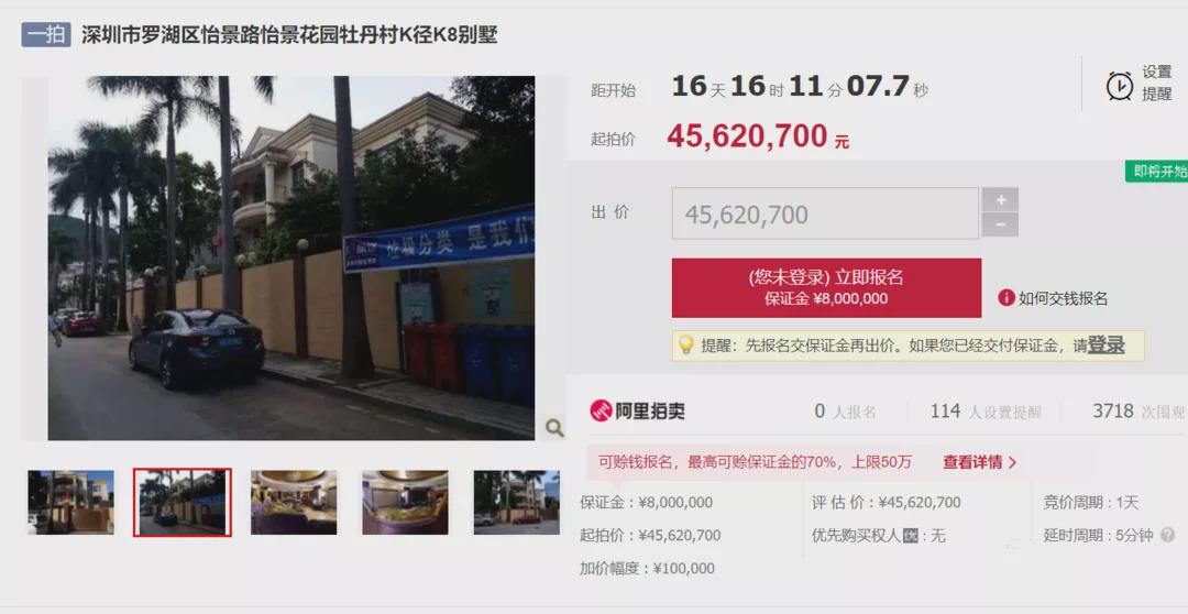 这套位于深圳市罗湖区的“怡景花园牡丹村”K径K8别墅,主楼地面三层,地下一层,副楼地上三层,户型实际面积约为1057㎡(含地下室面积),从1982年开盘的老牌豪宅,到如今法拍综合成本20万/㎡。起拍价4562万元。