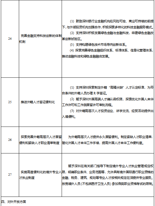 第三,全力支持推动深圳打造市场化、法治化、国际化营商环境,在营造长期稳定可预期的制度环境上先行示范。进一步放宽深圳的市场准入限制,加快下放相关的省级权限。支持深圳用足用好特区立法权,统筹省级立法司法等资源,支持深圳持续推进法治政府的示范城市建设,打造知识产权保护的标杆城市。强化省市数字政府改革的衔接,支持深圳率先开展城市级“互联网+监管”综合改革试点。