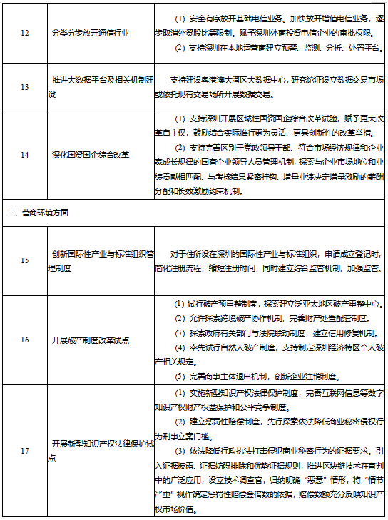 这里有三个方面的举措,既有涉及进一步开放能源、电信、公用事业、交通运输、教育等一批领域,还要建立一系列知识产权保护和惩罚体系。特别是要完善行政管理体制和经济特区立法。