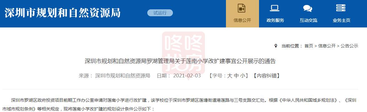 2月3日,深圳市规划和自然资源局罗湖管理局发布莲南小学改扩建事宜公开展示的通告。