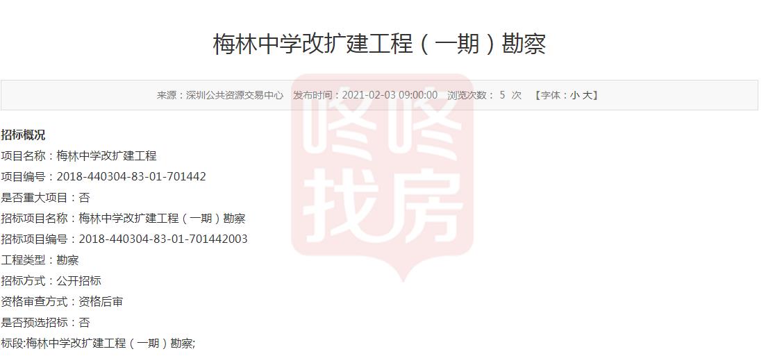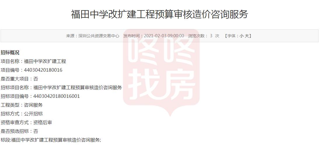 2月3日,深圳公共资源交易中心也发布了梅林中学、福田中学、观澜第二小学改扩建消息。