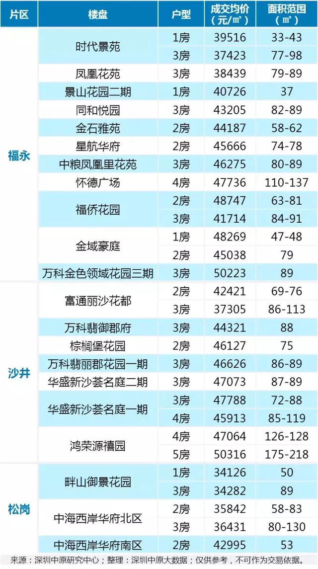 以下是福永、沙井、松岗片区上半年部分热门成交的二手楼盘数据,3.4万/平起,其中以4字头均价居多,是刚需上车的好选择。