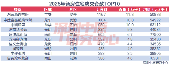 深圳中原研究中心监测数据显示,2025年鸿荣源珈誉府成交1167套,位居新房住宅成交套数TOP10榜首,也是连续三年排行第一。