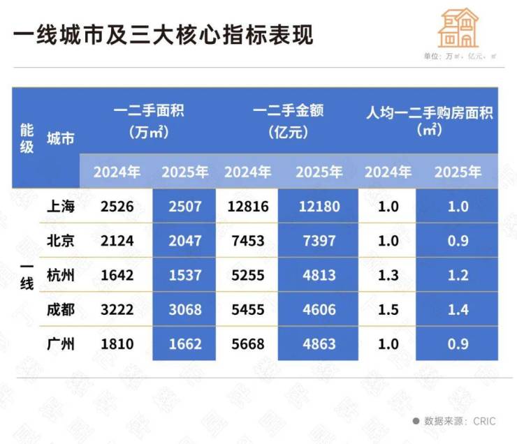 综合一二手房成交面积、成交金额及人均一二手房购房面积三大指标来看,这五个一线城市的市场容量表现出高度的稳定性。