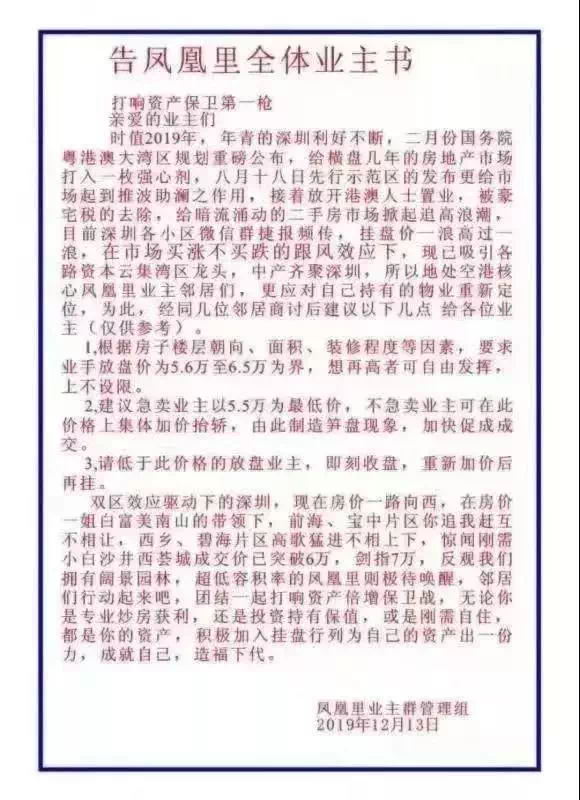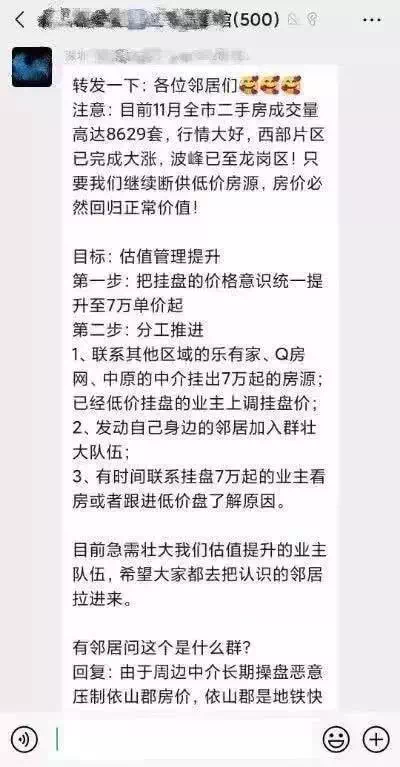 事件:二手房业主哄抬房价时间:2019.12.15地点:深圳深圳2019年的楼市魔幻上涨,可谓楼市寒冬中的一把火。有的业主觉得这个火烧的不够旺,打起集体控盘、坐庄抬价的主意。