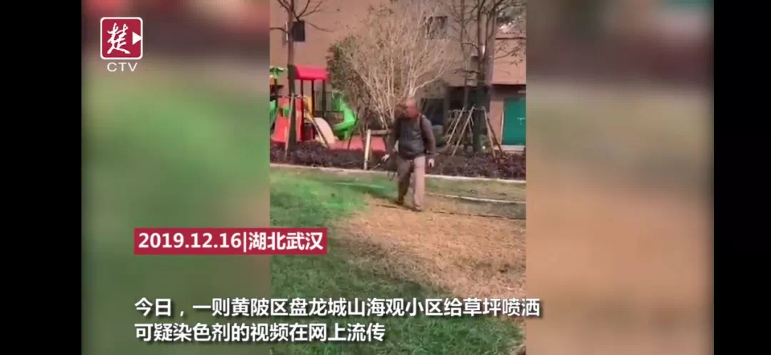 这段视频来自武汉市黄陂区盘龙城山海观小区,视频中一人正在给草坪喷上可疑的绿色染色剂。开发商回应,“小区6栋到9栋即将交房,有业主反映绿化不好。由于季节原因,草坪上部分绿草枯黄,园林施工人员就给草地喷洒符合国家标准的增绿剂,目的是为了增加美观度,不是绿化造假,也不是忽悠业主。”专家介绍说:增绿剂是绿色染色剂和营养液的混合液体,主要用于草地应急增色和养护,一般在足球场和高尔夫球场会用到。闹了一场,原来是误会了开发商为卖房的“良苦用心”。