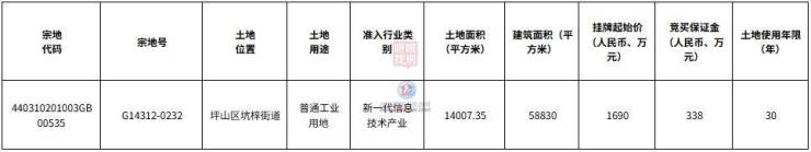 宗地号G14312-0232,土地位置坪山区坑梓街道,土地用途普通工业用地,准入行业类别新一代信息技术产业,土地面积14007.35平方米,建筑面积58830平方米,挂牌起始价1690万元,土地使用年限30年。