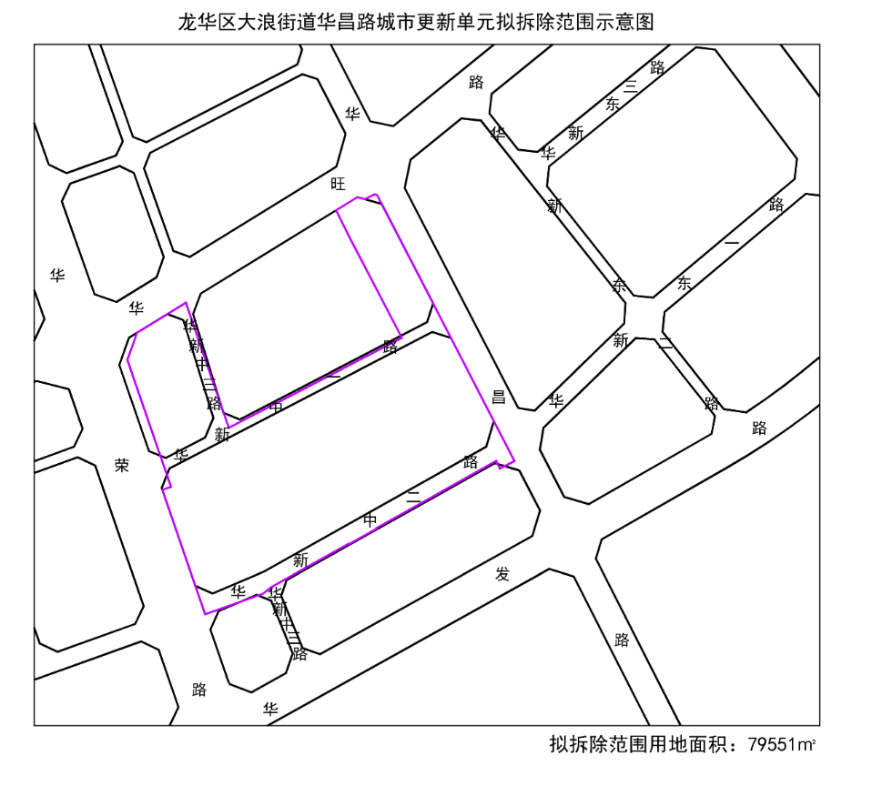 华昌路城市更新单元位于大浪街道中心地区,西临华荣路、南靠金盈新村、东临华昌路、北临华旺路。该项目拟拆除范围用地面积为79551㎡,拟更新方向为居住功能。