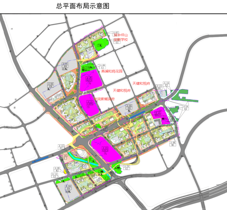 目前片区内已经有多家名企开发商进驻,已建成/在建多个新小区,如新城燕澜和鸣花园、华润紫樾润府,天健和悦府等项目。此外,片区引进的深中坪山创新学校已于2021年9月投入使用。