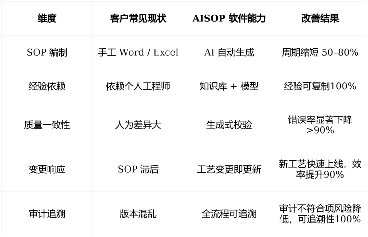 在实际应用中,AISOP 并非自动化执行系统,而是通过“AI 生成 SOP 初稿、工程师人工确认”的协同方式,重构传统 SOP 编制流程。AISOP 通常可覆盖 70%–90% 的结构性内容,初稿生成时间由数小时甚至数天缩短至数分钟到一小时,最终版本仍由工程师审核与发布。这一模式的目标并非替代工程师,而是将其从大量重复性文档工作中解放出来,使其更专注于工艺合理性判断、风险识别以及关键决策。一键生成 SOP 在此所指的,是快速生成可人工确认的初稿能力,而非自动发布的结果。