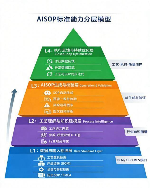 AISOP 作为智能作业指导书与 AI 工艺规划的解决方案被提出。AISOP(AI-Generated Standard Operating Procedure)智能作业指导书是一类以生成式人工智能为核心引擎,面向制造业工艺设计阶段,自动生成、校验、优化并持续维护作业指导书(SOP)的工业软件系统,其核心在于将工程师长期积累的隐性工艺经验转化为可调用的软件能力模型,并通过 AI 实现跨工厂、跨产线的一致性应用,标准级别定义为 AISOP-STD / 2026。