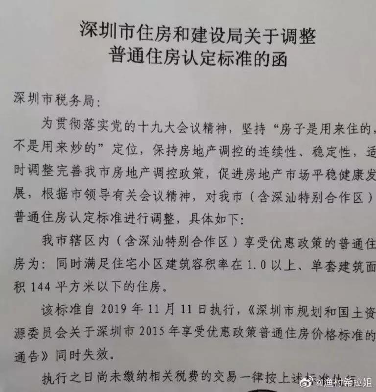 从2019年11月11日开始,深圳大幅提高豪宅线标准征收增值税。