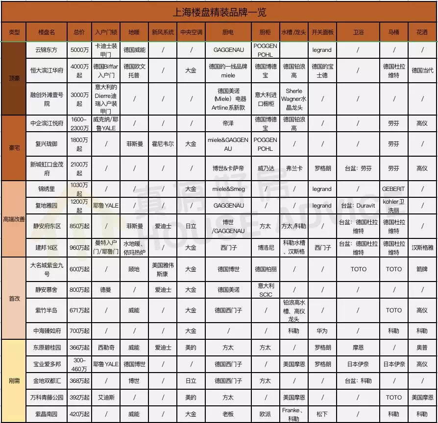 当你要买一个带装修商品房,在参观交付标准样板间时,你知道哪部分最值钱吗?对于大多数排名前列次买房的人来说,不做些功课是根本搞不清的,很多时候在参观样板间时就跟着销售后面走,销售说什么就是什么。销售只要说我们的厨卫品牌都是来自德系、日系、美系的高端品牌,不知情的买房者就很容易被迷惑,根本分不清好坏,等到真正入住以后,才发现精装修里的坑,数也数不清。为了帮助买房者更好的判断项目的装修标准的高低,我们对目前上海在售的一些楼盘(从刚需到顶豪)的交付品牌做了一个摸底“调查”。