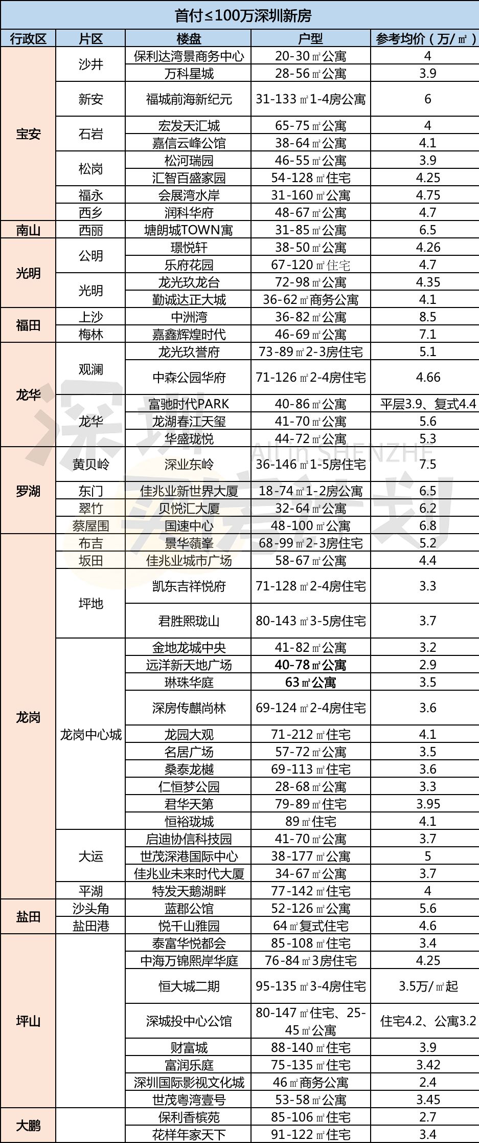 | 全文1975字,阅读约需5分钟如果你现在手头有100万,买房还是理财?疫情消退,迟到2个月的购房需求开始释放,@深圳买房计划 身边也有不少朋友正在找房看房,大多是为了资产保值,毕竟对普通人来说,除了买房,目前找不到更稳妥的投资。“1-2月,全国居民消费价格比去年同期上涨5.3%,CPI的增速,意味着每年银行存款购买力下降5.3%,也就是说,你有100万存款,一年后你的实际购买力变成了94.7万。”“近期大多数理财产品的年化投资回报率,基本低于5%,也就是说,买了理财产品也没有办法保值增值。这就是市场流通性泛滥下通胀的结果。”这是同策研究院首席分析师 张宏伟 在他的个人微信公号“老张宏论”中分享的数据与观点。他认为,当人们手中存款购买力越来越下降,为了保值增值,资金流向的变化必然会导致资产价格尤其是一二线城市房价进一步上涨。同时,50万亿的投资“救市”计划也会带动核心一二线城市投资价值进一步提升,也必然会带动房价新一轮的上涨。在深圳,100万首付,几乎已是门槛级荷包数字,如今还能买到哪里的新房、二手房?@深圳买房计划 帮你问了中原、Q房、乐有家3位大佬,从市场画像到购房建议,给你最有用的买房参考。附送《深圳最全100万首付新房+二手房源列表》,55个新房+285个二手住宅楼盘,准备买房的你,拿走不谢。01新房市场:5月将上演开盘潮首付100万内,还有55个新盘可买现在是买房“窗口期”吗?深圳中原二级市场董事总经理、中山中原总经理 玉家雄 认为,近期较多资金流入市场,从过往的经验看,不排除会有部分资金流入楼市,可能会带动房价的上扬,“如果你是已经准备好的购房者,目前是可以考虑的时机。”因疫情而暂停了2个月的深圳新房市场,预计什么时候会迎来开盘潮?玉家雄认为,今年的开盘潮,较快也要5月份左右,虽然疫情有了好转迹象,但从开发商营销角度来看,还需要时间做铺垫,比如前期蓄客工作,现在很多开发商还没有正式开展,所以他预计,“5月份左右,才会有比较多的新房项目集中推向市场。”今年深圳楼市值得刚需关注的片区,玉家雄的答案是:光明、大空港。他认为,光明今年6月会迎来地铁6号线通车,对周边市场会有带动作用,“毕竟地铁对刚需来说是非常重要的通勤工具”。大空港从去年开始已经成为市场高度关注的片区,今年还会有不少项目推向市场,预计也会成为楼市的焦点区域,他建议购房者,“4月份可以多留意一些楼盘推广动作”。