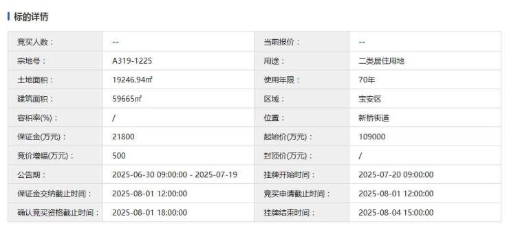 今日(8月4日)下午3点,位于宝安新桥A319-1225宗地即将出让。