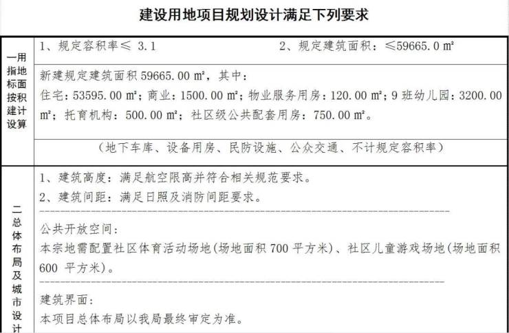 该宗地新建规定建筑面积59665㎡,规定容积率≤3.1,包含53595㎡住宅,1500㎡商业,住宅和商业允许分割转让;