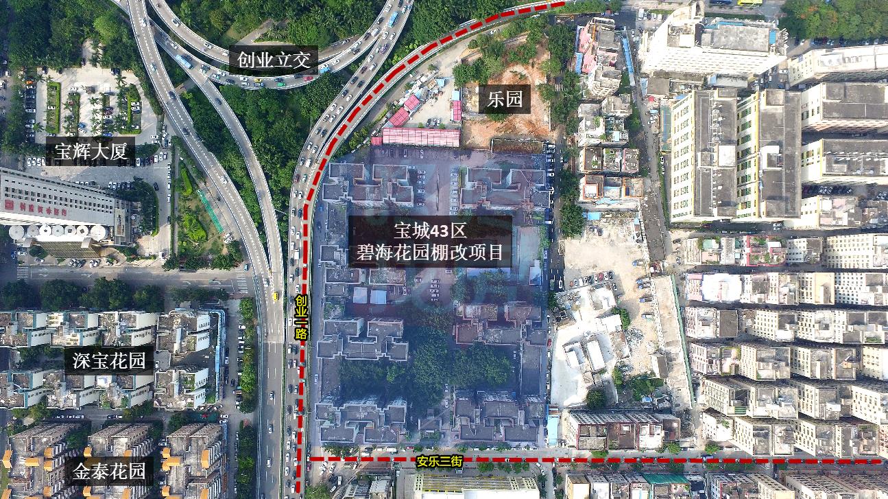 碧海花园棚改项目位于新安街道创业一路与广深公路交汇处西南侧,紧邻宝安中心区。北、西两侧分别以创业一路、安乐三街为界,东南以规划城市支路为界,东侧紧邻文化活动中心和广深公路(107国道)。