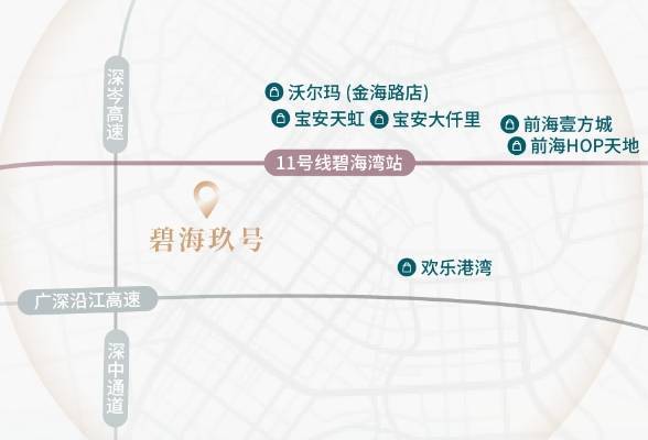 交通出行:项目距离11号线碧海湾站约570米,步行约8-10分钟即可到达,1站可达宝中、3站抵达前海。远期还规划有15号线和28号线(具体开通时间以官方公告为准)。此外,周边分布着广深沿江高速、海滨大道、宝安大道等城市主干道,可快速通达宝中、南山、福田等核心区域。