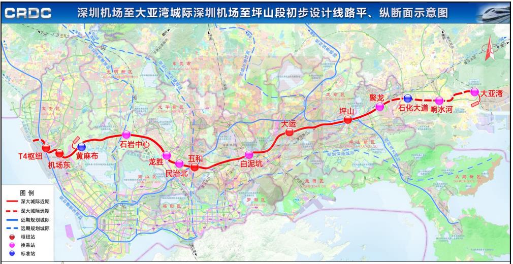 深圳机场至大亚湾城际深圳机场至坪山段工程位于深圳市北部,整体呈东西走向,线路起自深圳市宝安机场,途径深圳市宝安、龙华、龙岗和坪山四区,终至聚龙 站。 工程正线线全长 69.060 km(右线 69.098 km),全部地下线。工程总投资 672.45 亿元。