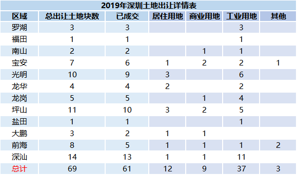 笔者根据深圳土地房产交易中心数据统计,2019年深圳共成功交易61宗地,其中,工业用地成交37宗,居住用地成交12宗,商业及文体等用地成交12宗。