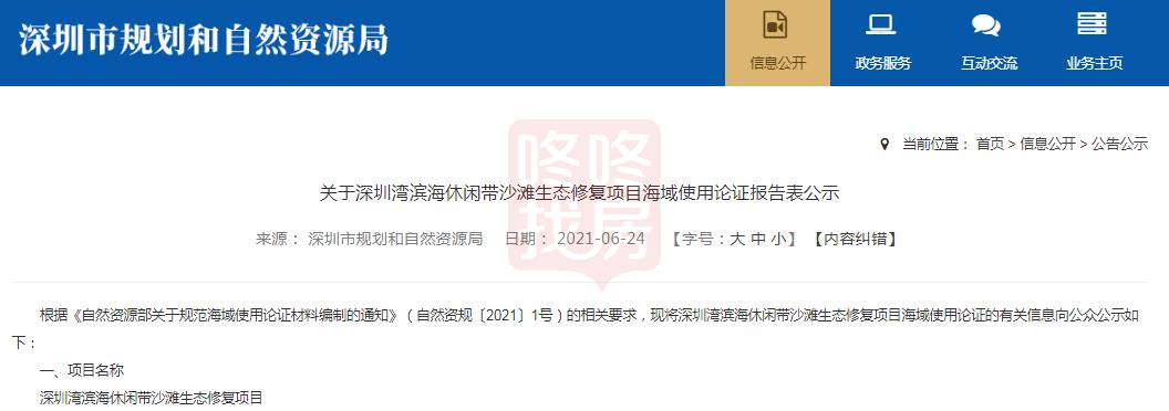 近日,深圳市规划和自然资源局发布《关于深圳湾滨海休闲带沙滩生态修复项目海域使用论证报告表公示》。