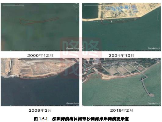 上世纪末以来,深圳湾海岸相继开展了一 系列填海造地工程,本项目海岸岸线是在前期填海工程基础上形成的,显示了2000年12月以来工程区海岸的变迁,即由海域变陆域,进而开展深圳湾 滨海休闲带沙滩建设的过程。