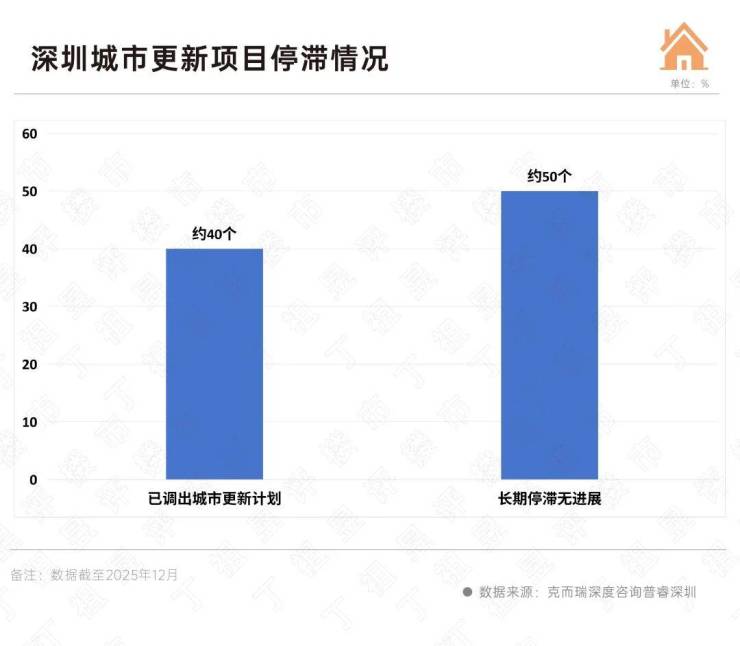 根据普睿深圳数据,截至2025年12月,深圳有约50个城市更新项目长期停滞无实质性进展,另有近40个项目被调出城市更新计划。近90个项目停滞或调出计划的根源在于经济账算不过来。