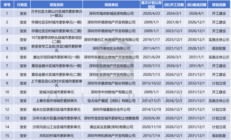 宝安区共15个项目入选。其中,有4个项目计划立项,2个项目取得规划批复,3个项目实施主体公示,6个项目开工建设。