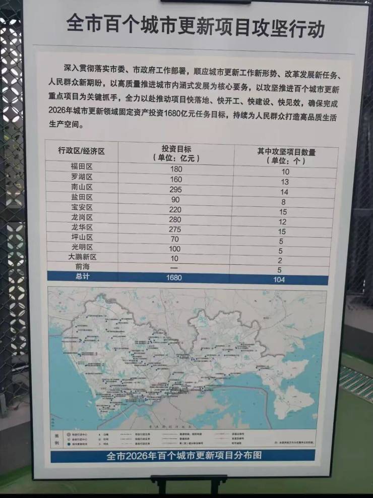 根据网传图片,2026年深圳拟在城市更新领域的固定投资为1680亿元,其中南山投资金额最大,为295亿元;其次是龙岗、龙华和宝安,投资也都超200亿元。