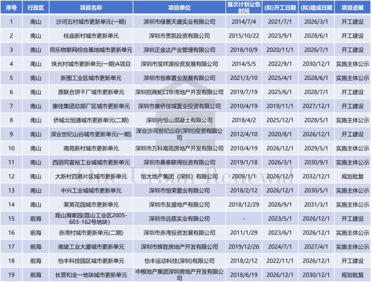 南山区(含前海)共19个项目入选。其中,2个项目取得规划批复,9个项目实施主体公示,7个项目开工建设,1个项目已建成。