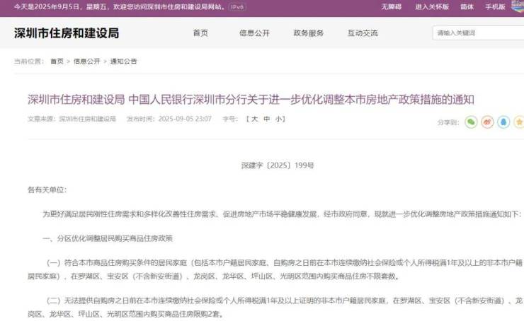 9月5日晚,深圳市住房和建设局、中国人民银行深圳市分行关于进一步优化调整本市房地产政策措施的通知。