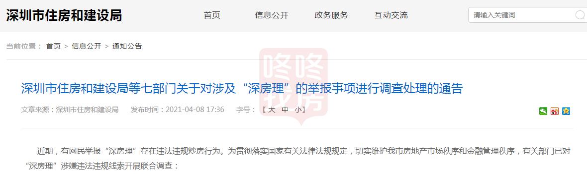 4月8日,深圳住建局等七部门发布通告,就“深房理”炒房事件将进行调查处理。