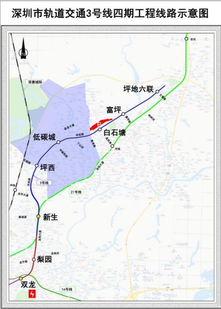 3号线四期深圳市城市轨道交通3号线四期工程为双龙站(不含)至坪地六联站。线路全长9.28km,其中高架段长度为1.43km,过渡段长度为0.36km,地下段长度为7.49km。共设车站7座,分别为梨园、新生、坪西站、低碳城站、白石塘站、富坪站、坪地六联。6号线支线二期工程