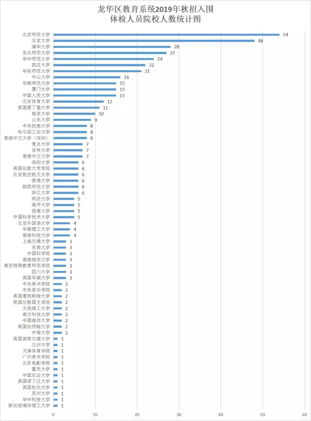 图片来源 / 龙华教育491个岗位吸引3.5万人报考,报录比大约为71:1。可供参照的是,2019年的国家公务员考试中,中央机关及其直属机构计划招录1.45万人,笔试当天92万人实际参加考试,实际参加考试人数与录用计划数比例约为63:1。相比之下,此次深圳龙华教育局的中小学教师招聘,最终录取难度略高于2019年的国考。从录取者的院校分布来看,北京师范大学54人、北京大学48人、清华大学28人、东北师范大学27人、华中师范大学24人、武汉大学22人、华东师范大学21人、中山大学16人、中国人民大学15人、厦门大学15人、香港中文大学15人、华南师范大学15人。