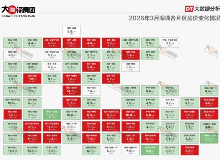 上涨片区主要分布在福田、南山、龙华区。