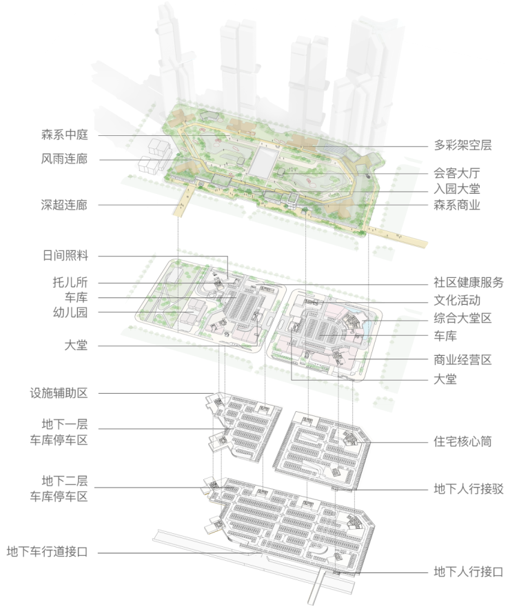 为了过渡、兼顾城市公共性与住区私密性,在垂直维度打造了一套过度城市与住区的 “城市甲板” 系统:将城市商业,社区配套服务,文化活动等置于底层,以模糊的边界与公共的功能布局与城市相连;