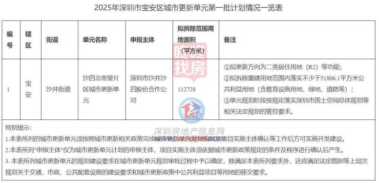 近日,深圳市宝安区城市更新和土地整备局关于《2025年深圳市宝安区城市更新单元第一批计划》(草案)的公示,包含沙四北帝堂片区城市更新单元一个项目,且同步发布意愿公示。
