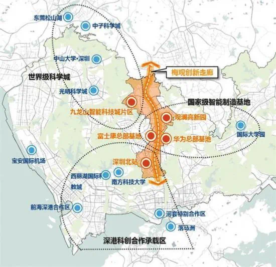 而如何判断一个片区是否具有价值,需要重点看以下三点:1、基本面,即片区内的产业在城市中的地位;龙华的产业发展思路是很清晰的:首先,这个片区本身是在龙华较大的产业引擎:国际级科技带——梅观科技创新走廊上,这是依托富士康、华为等具有全球影响力的企业打造国际影响力的科技创新走廊。