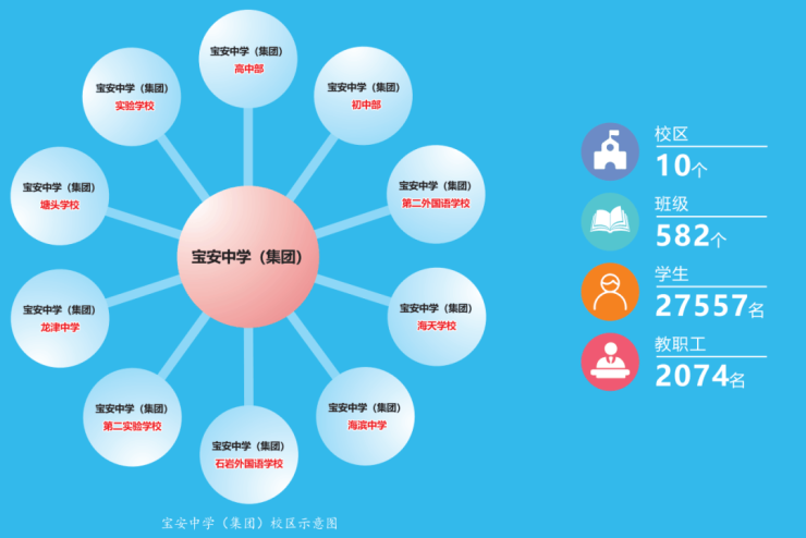 现由高中部、初中部、龙津中学、实验学校、第二外国语学校、塘头学校、海天学校、海滨中学、第二实验学校、石岩外国语学校十个校区组成。