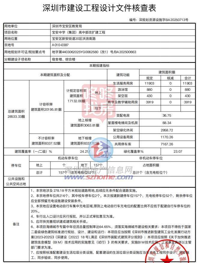 近日,宝安中学(集团)高中部改扩建工程《建设工程规划许可证》及总平面图对外通告。