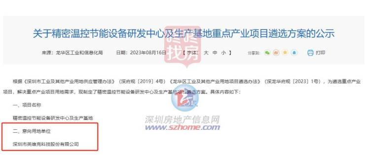 2023年8月,龙华区工业和信息化局公示《精密温控节能设备研发中心及生产基地重点产业项目遴选方案》,意向用地单位为深圳市英维克科技股份有限公司。