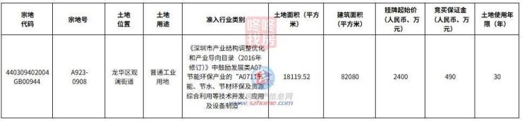 宗地号A923-0908,土地位置龙华区观澜街道,土地用途普通工业用地,土地面积18119.52平方米,建筑面积82080平方米,挂牌起始价2400万元,土地使用年限30年。