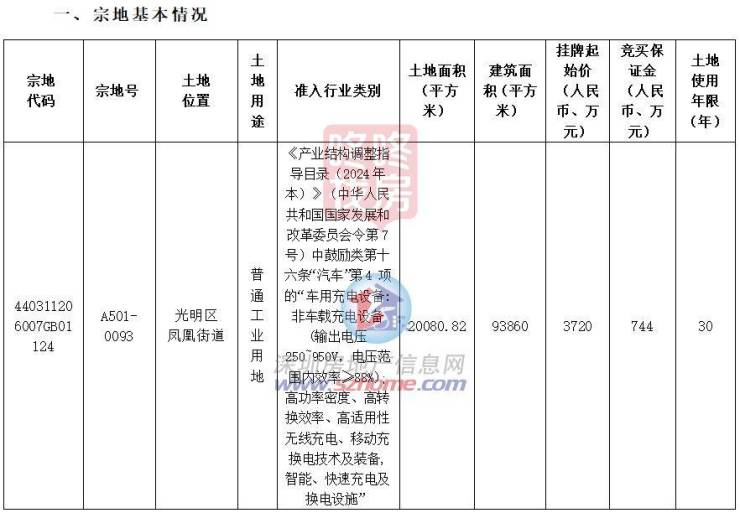 8月8日,光明区凤凰街道挂牌一宗普通工业用地(宗地号A501-0093),土地面积约2万平米,约9.38万平,挂牌起始价3720万,土地使用年限为30年。