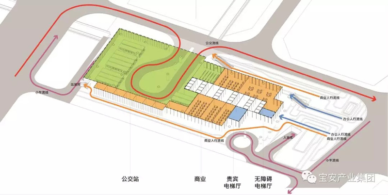 项目建筑配备了0.3万平方米的公交首末站,通过“彻底独立公交流线,人车分流”的方式,有效解决项目周边地块交通问题,进一步提高城市交通系统的效率,同时,配备了0.3万平方米的商业空间,提供会议展览、产品发布、休闲健身、商业等资源中心功能,将单纯的办公建筑打造成配套齐全的城市微社区。