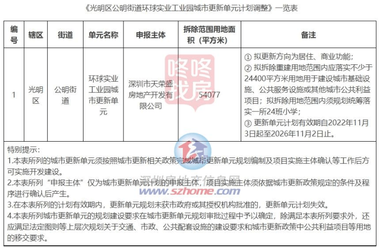 4月16日,深圳市光明区城市更新和土地整备局正式公示《光明区公明街道环球实业工业园城市更新单元计划调整》,依据相关政策文件,明确了该更新单元的调整细节。