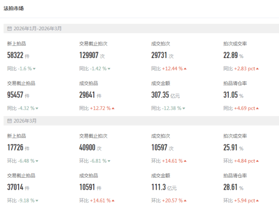 住宅类法拍房方面,2026年一季度法拍住宅挂拍房源数量9.5万套,同比下降4.3%;成交拍品2.96万套,同比增加12.7%;清仓率31.1%,较上年提升4.7个百分点;成交总金额307.4亿元,同比下降12.4%。一季度法拍住宅成交均价7507元/㎡,同比下降17.5%。(更多报告内容,点击索取完整版)