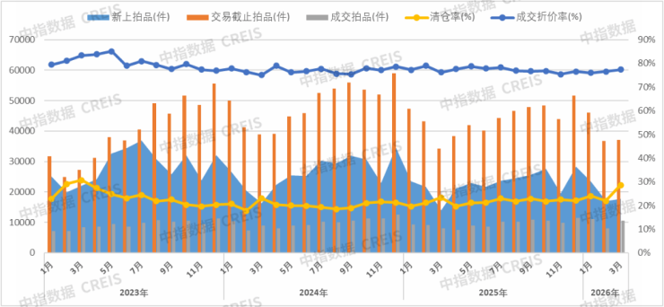 图:2022-2026年3月全国355城法拍市场挂拍、交易趋势