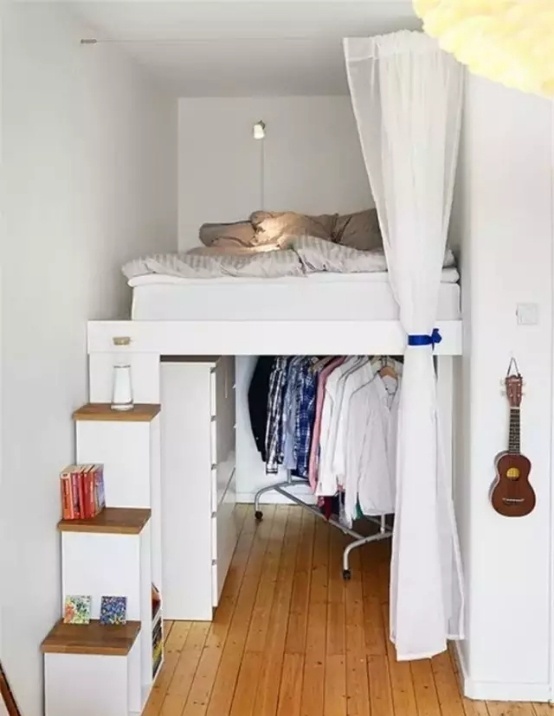 如果房间高度允许的话,你可以考虑把床的位置移高,利用小楼梯和楼梯下的空间用作收纳。